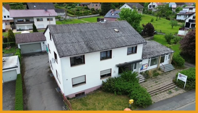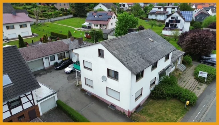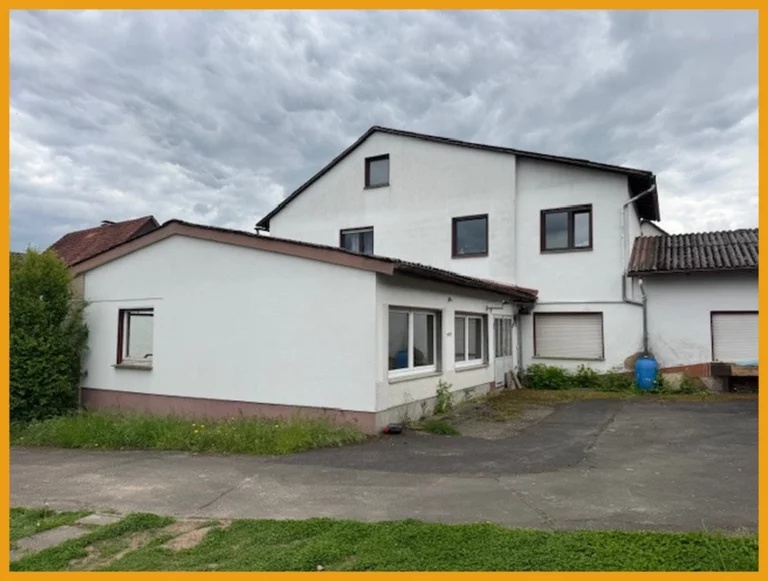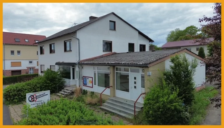 Dieses Wohn- und Geschäftshaus wurde im Jahr 1962 massiv erbaut. Im Erdgeschoss des Haupthauses finden Sie eine rund 47m² große Ladenfläche, die früher als Bäckerei genutzt wurde. Hierzu finden Sie im hinteren Anbau die ehemalige Backstube mit Kühlzellen und Lagerräumen. Ebenfalls sind Abstellräume und ein WC vorhanden. Ein weiterer Anbau rechts der Straßenansicht wurde bisher als Sparkasse genutzt und verfügt über etwa 70m² Fläche mit einem Büro und einem separaten WC. Im Erdgeschoss des Haupthauses befindet sich eine Wohneinheit mit zwei Zimmern, einer Küche und einem Badezimmer auf ca. 67m². Im Obergeschoss finden Sie eine weitere Wohnung mit rund 105m². Diese gliedert sich auf in drei Schlafzimmer, ein Wohnzimmer, eine Küche und ein Badezimmer. Für Ihre PKW stehen Ihnen eine Garage und fünf Außenstellplätze zur Verfügung. Das Grundstück ist zudem so groß, dass Erweiterungsmöglichkeiten gegeben sind. Die obere Wohneinheit ist derzeit vermietet, die Gewerberäume stehen Ihnen sofort zur Nutzung oder Umnutzung zur Verfügung, daher wurde in den Kurzdaten die Gesamtfläche als "Wohnfläche" ausgewiesen. Hier könnte man nämlich mit handwerklichem Geschick weiteren Wohnraum schaffen.