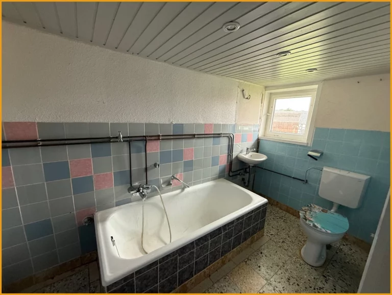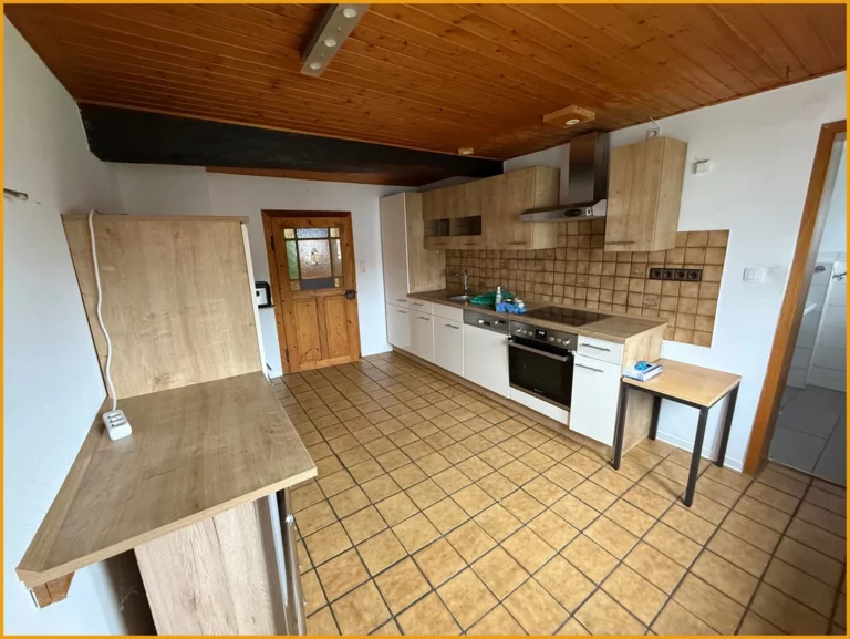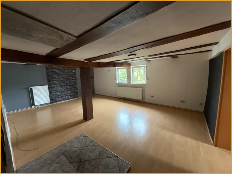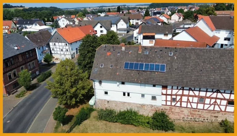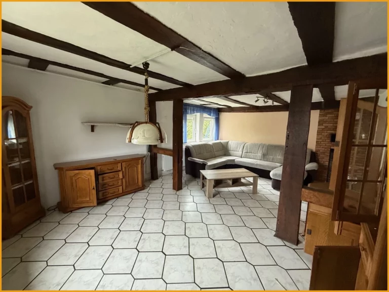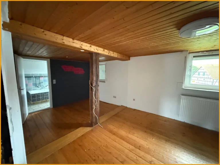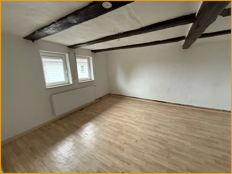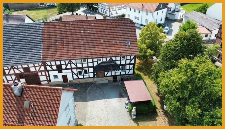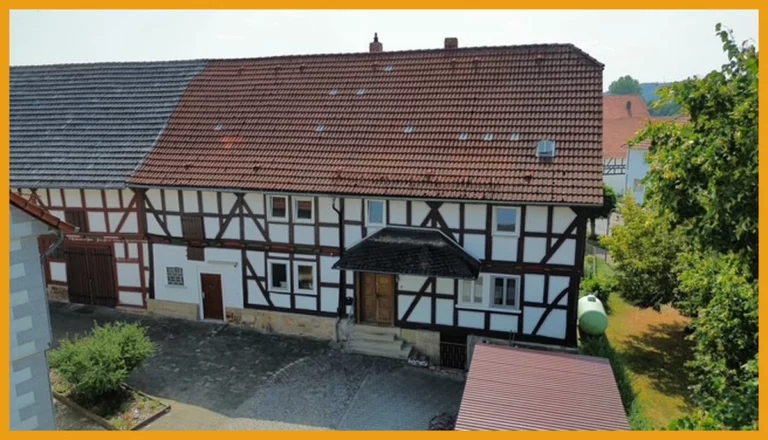 Hier können Sie kurzfristig einziehen! Das Fachwerkhaus wurde ursprünglich im Jahr 1751 erbaut und verfügt heute über rund 150m² Wohnfläche, auf zwei Etagen. Das Erdgeschoss gliedert sich auf in ein geräumiges Wohnzimmer mit freigelegten Balken, ein Schlafzimmer, zwei Abstellräume, einen Hauswirtschaftsraum mit direktem Zugang in die Tenne, eine Küche und ein fast neuwertiges helles Badezimmer mit Dusche und WC aus dem Jahr 2018. Das Obergeschoss verfügt über drei Schlafzimmer, einen Abstellraum und ein weiteres Badezimmer aus den 50er Jahren. Das Dachgeschoss des Hauses ist zudem ausbaufähig oder kann aktuell zum Lagern und Abstellen verwendet werden, ebenso die kleine Tenne, die im Erdgeschoss ideal für Zweiräder etc. geeignet ist. Unter dem Haus befindet sich ein Kriechkeller für Ihre Vorräte. Für Ihre PKW stehen Ihnen direkt vor dem Haus Stellplätze auf dem Hof zur Verfügung.